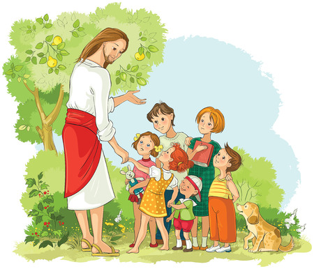 Jesus christ reading the bible with children.jesus preaching to a group of kids. template for advertising brochure. ready for your message. vector illustration